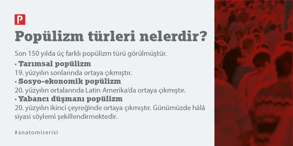 Tarihsel olarak son 150 yılda popülizm üç farklı şekilde karşımıza çıkıyor. İlk olarak 19. yüzyılın sonlarında ortaya çıkan “tarımsal popülizm”, ardından 20. yüzyılın ortalarında Latin Amerika’da “sosyo-ekonomik popülizm” ve son olarak, 20. yüzyılın ikinci çeyreğinde Hitler, Franco ve Mussolini gibi diktatörlerin iktidara gelmelerini sağlayan, bugün ise tekrar gündemimizde olan ve siyasi söylemi şekillendiren “yabancı düşmanı popülizm”.