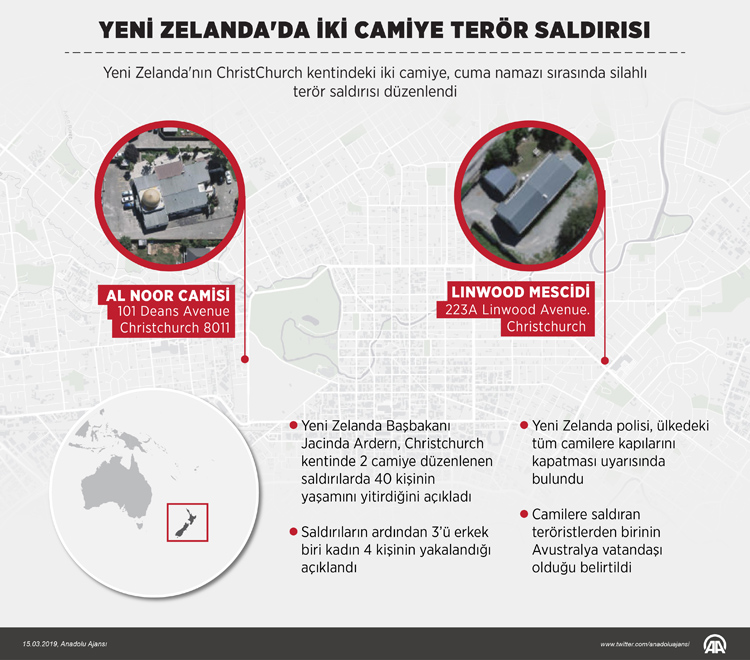 Yeni Zelanda’nın Güney Adası’ndaki Christchurch’ün Hagley Park bölgesindeki Al Noor Camisi ve Linwood’daki camiye kimliği belirsiz kişiler tarafından cuma namazı esnasında terör saldırısı gerçekleştirildi.