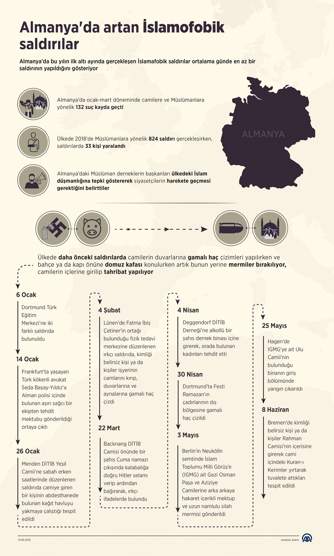 Almanya İçişleri Bakanlığı, Mecliste bir soru önergesine verdiği cevapta, yılın sadece ocak-mart döneminde camilere ve Müslümanlara yönelik 132 suçun kayda geçtiğini açıkladı. Bakanlığın cevabında, bu oranın kesin olmadığına, kayıtlara eklenecek nisan-haziran dönemindeki suçlarla bu sayının daha da artabileceğine işaret edildi. Güvenlik uzmanları ise her saldırının rapor edilmemesi nedeniyle bu rakamın daha yüksek olduğu konusunda hemfikir.