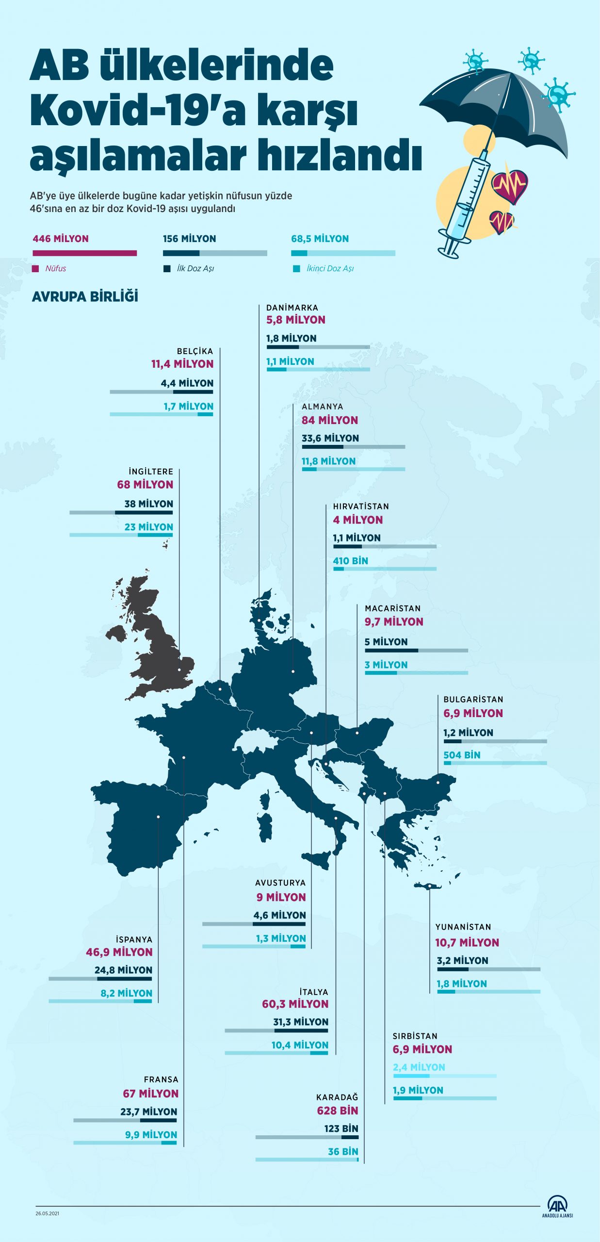 AB Komisyonu Başkanı Ursula von der Leyen, 25 Mayıs’ta sosyal medya hesabından, bu hafta yaklaşık 450 milyon nüfusa sahip AB’deki yetişkin nüfusun yarısına ilk doz aşıların yapılmış olacağı bilgisini paylaştı. Von der Leyen, “Şimdiye kadar 300 milyon doz aşı tedarik edildi. 245 milyon doz aşı uygulandı. AB yetişkin nüfusunun yüzde 46’sına en az bir doz aşı yapıldı.” ifadelerini kullandı.